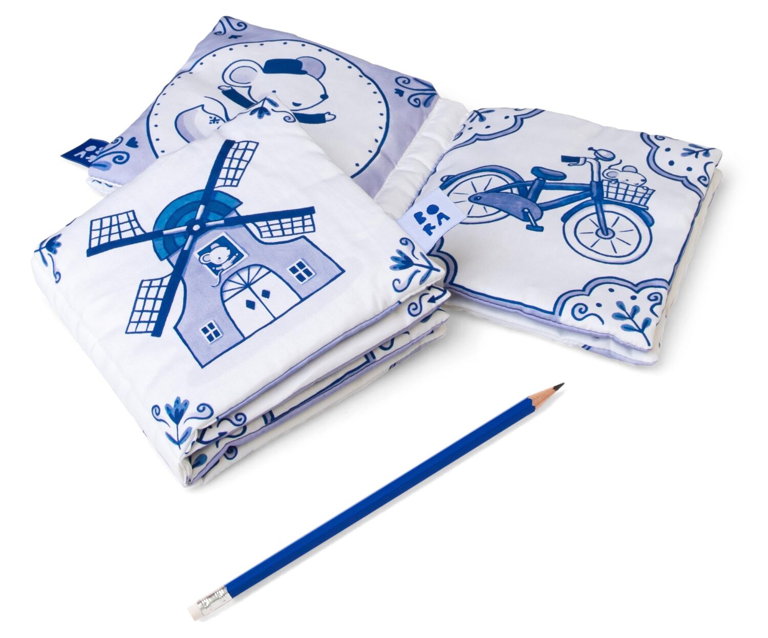 Zacht Delfts blauw knuffelboekje over typisch Nederlandse concepten, voor baby's vanaf 1 jaar.