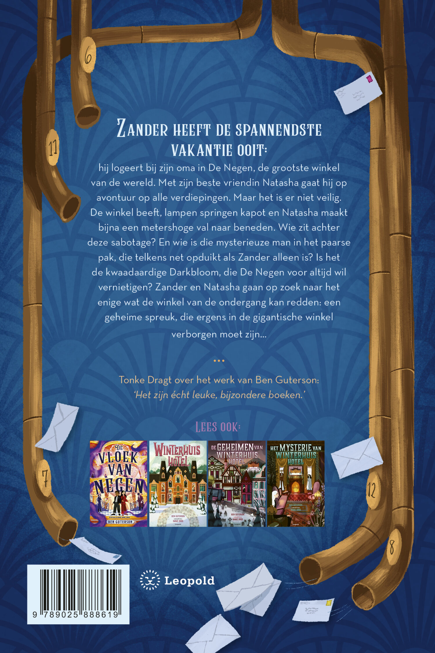 Voor de liefhebbers van Winterhuis Hotel is er nu  De schaduw van Negen  van Ben Guterson het spannende tweede deel, weer meesterlijk vertaald door Imme Dros. In dit nieuwe avontuur vol woordpuzzels en aanwijzingen worden Zander en Natasha meegezogen in De Negen, het bijzondere winkelcentrum van Zanders oma met duizelingwekkende verdiepingen. Werknemers van het warenhuis gedragen zich vreemd en Zander en Natasha worden het doelwit van aanvallen. Wanneer een verwoestende magische spreuk De Negen in gevaar brengt, raken Zander en Natasha verwikkeld in een race tegen de klok om het wereldberoemde winkelcentrum te redden van de ondergang.