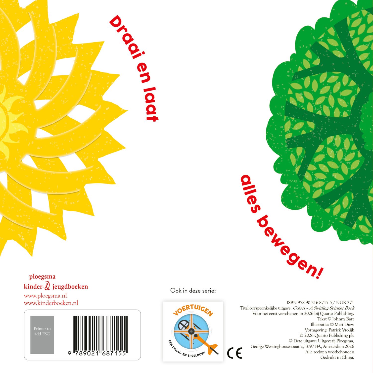 Dit kleurrijke kartonboek is leuk om mee te spelen, samen met je baby of peuter. Op elke spread vind je een draaiende spinner. Perfect voor de ontwikkeling van de fijne motoriek van jonge kinderen, en hun visuele waarneming. De woorden zijn eenvoudig, en de tekst erbij is op rijm. Het contrastrijke ontwerp spreekt de allerkleinsten aan. In dezelfde serie is ook een boek over Voertuigen verschenen. Samen lezen was nog nooit zo interactief!