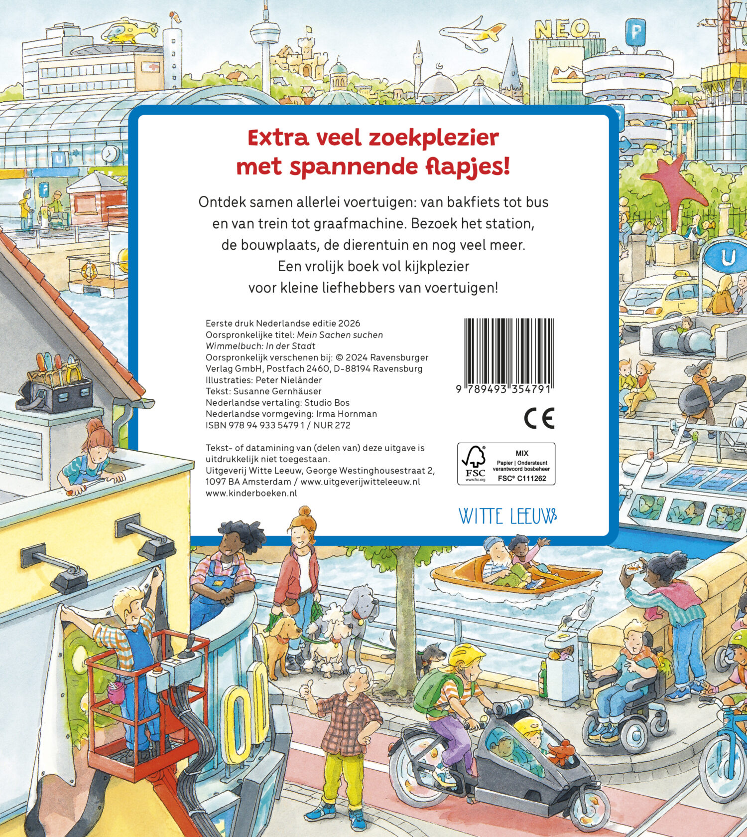 Ga je op de bakfiets, of toch liever met de bus of de auto? Bezoek het treinstation, rij over een brug over de rivier en neem een kijkje op de bouwplaats. Er is ook een dierentuin en een grote snuffelmarkt. In de stad is van alles te zien! Het leukste boek voor kleine liefhebbers van heel veel soorten voertuigen!