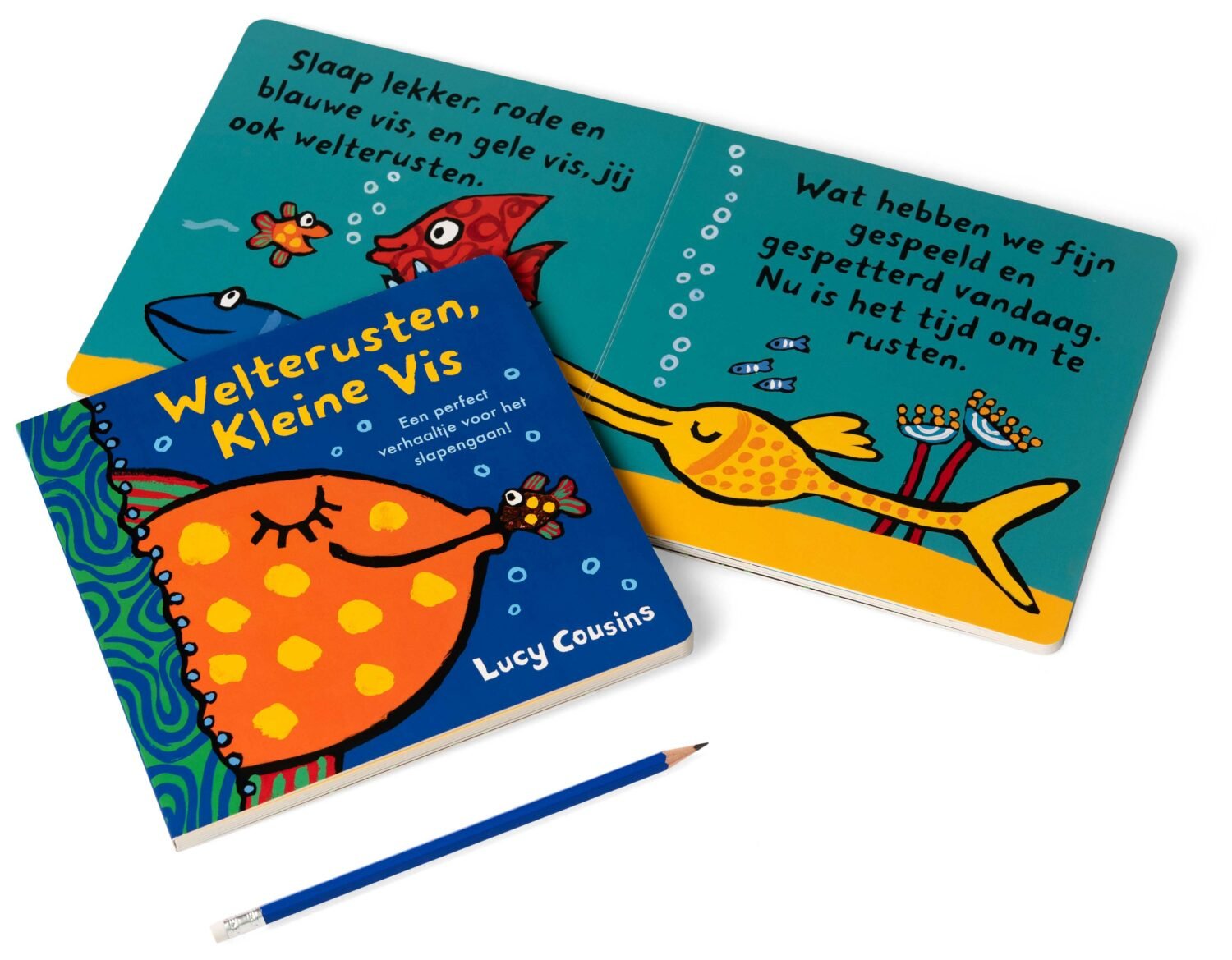 Kleine Vis zwemt langs al zijn vriendjes voordat hij in zijn bedje kruipt. En natuurlijk krijgt hij een kusje van Mama Vis.