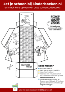 O, kom maar eens kijken… wat je bij kinderboeken.nl in je schoentje kunt vinden! Download het knutselblad, kleur hem zo mooi mogelijk in, en stuur een foto van jouw schoentje op naar info@kinderboeken.nl voor 1 december 2025. Op 2 december kiezen we uit de ingezonden schoentjes vijf kinderen die van ons een schoencadeautje opgestuurd krijgen. Laat ons vooral weten welk van de vijf cadeautjes op deze pagina op jouw verlanglijstje staat, en wie weet ontvang jij wel een mailtje van onze hulppieten!