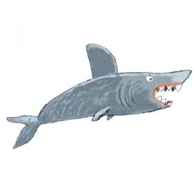 De waakhaai. Hij zwemt door de gracht rond het piratenhuis en hapt naar alles wat te lang op de loopbrug blijft staan.
