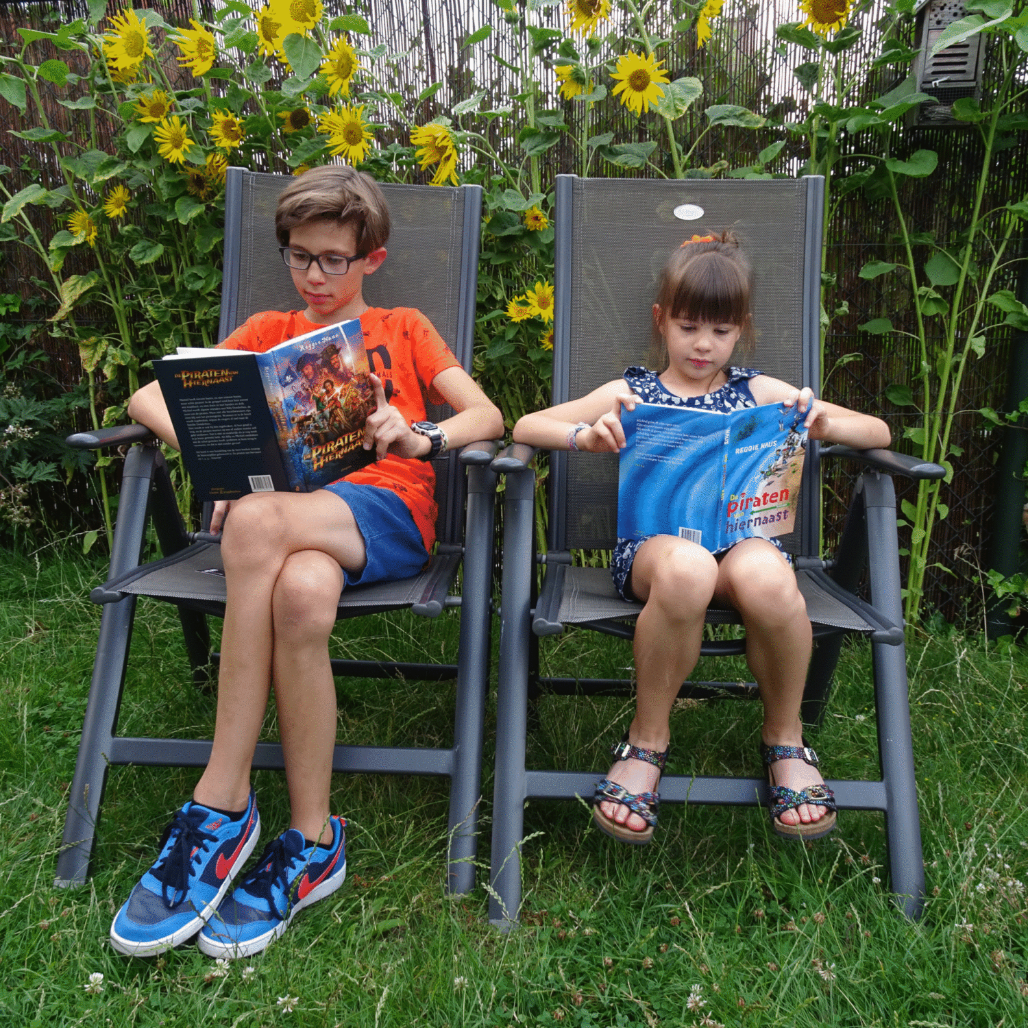 Tristan en Merlin lezen de filmeditie en AVI-editie van De piraten van hiernaast.
